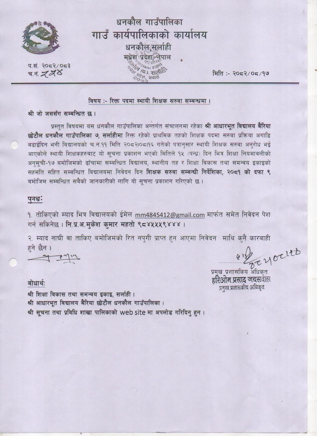रिक्त पदमा स्थायी शिक्षक सरुवा सम्बन्धी सूचना । मिति २०८१-०९-१७