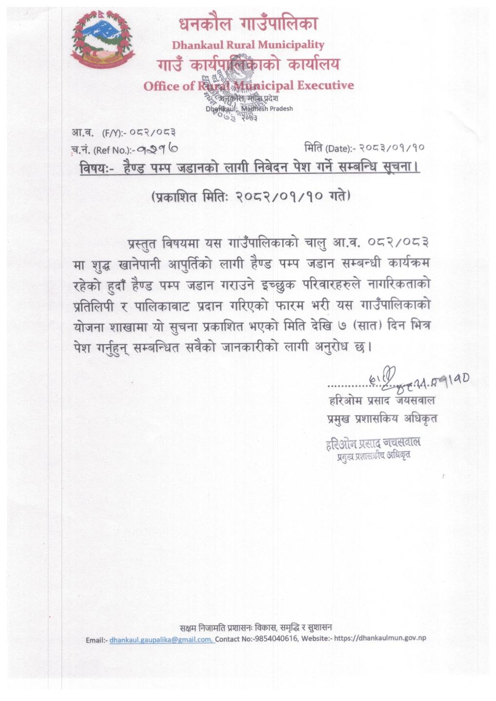 हैण्ड पम्प जडानको लागी निबेदन पेश गर्ने सम्बन्धि सूचना।