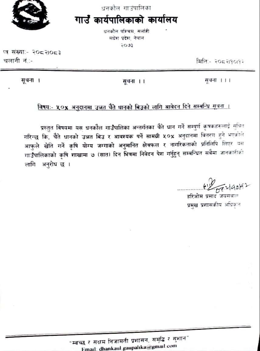 » ५०% अनुदानमा उन्नत चैते धानको बिउको लागि आवेदन दिने सम्बन्धमा ।